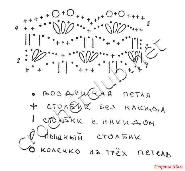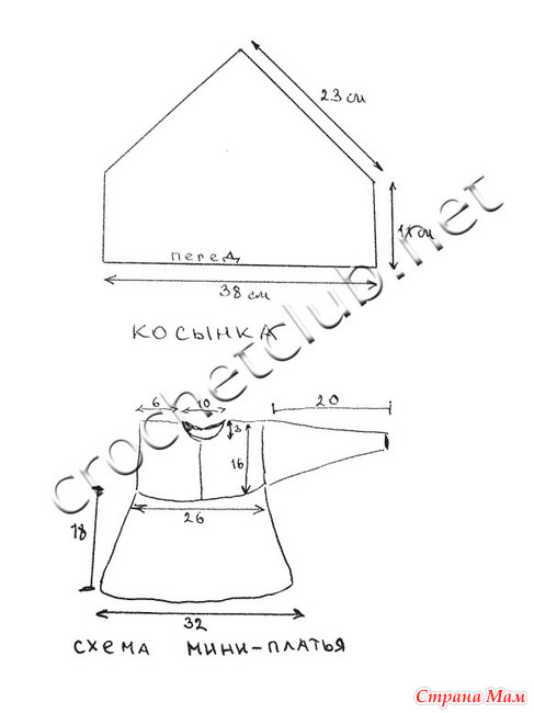 Кокетка платья связана столбиками с накидом через одну воздушную петлю вместе: начиная от переда, через плечи вышла я к спине, а подол вязала по кругу узором, схему которого прилагаю. Рукава вязала от проймы по кругу все тем же узором.