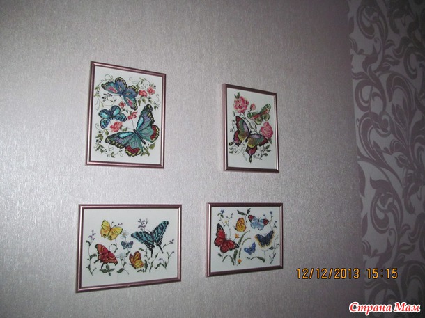 Ну и наконец-то у меня дошли руки и я повесила вышивки на стену... Заодно оцените, как они вписались в интерьер моей спальни... в смысле цвета стен и цвета рамок...