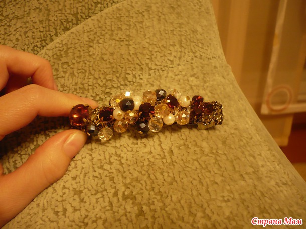 эта заколочка маме, бусины и стразы хорошие, очень красиво играют на свете, но был по бокам клей + видна обмотка леской. лишнее убрала, попрятала, теперь ляпота, главное мама довольна
