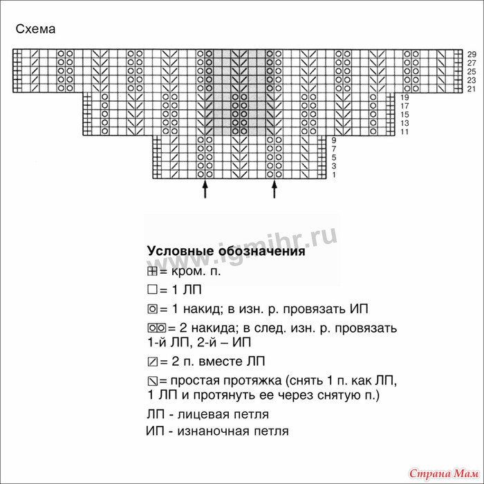 Ажурный узор: вязать по схеме, при этом начинать с 20 п. Числа справа обозначают лиц. ряды. В изн. рядах петли и накиды провязывать изн. или как указано в условных обозначениях. В центре схемы между стрелками 1 раппорт выделен серым цветом (= 8 п. в ширину и 20 р. в высоту). В 11-м и 21-м р. набрать с обеих сторон по 8 новых п. В ширину вплоть до 30-го р. показаны все петли. В высоту провязать 1 раз 1-30 ряды, затем повторять 11-30 ряды, при этом продолжать последовательно прибавлять петли с обеих сторон.
