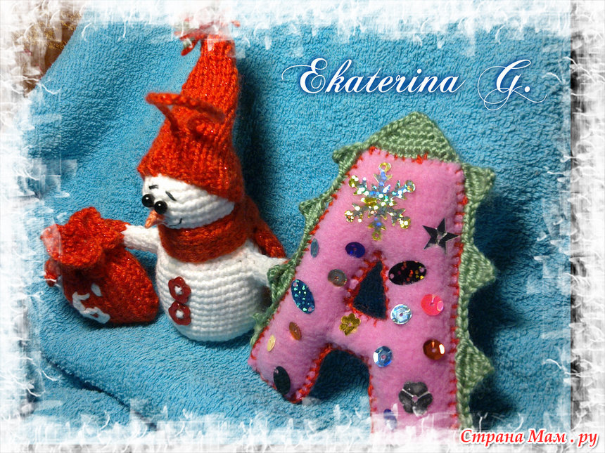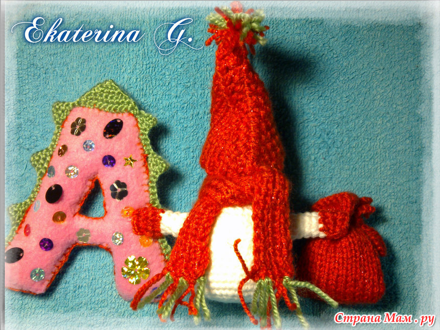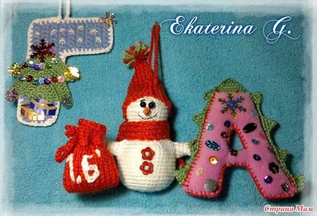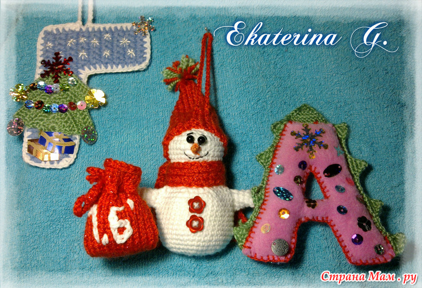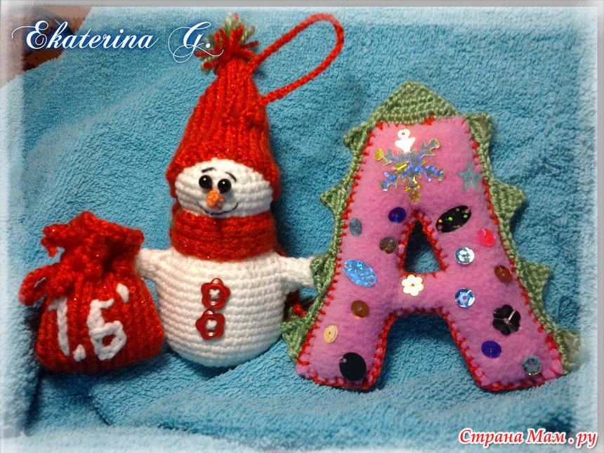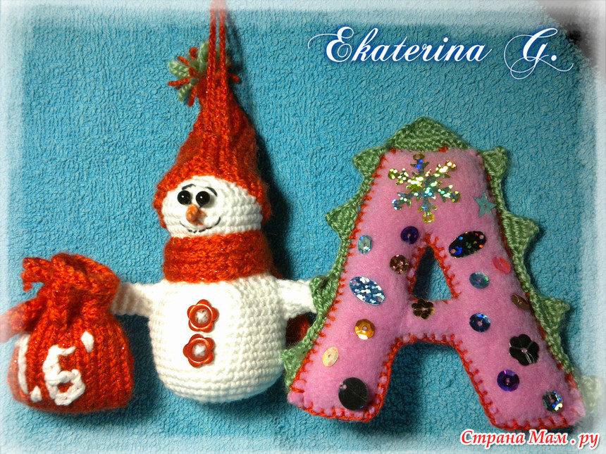 Нам достались буквы Г и А (инициалы моей дочери)... Использовала разную пряжу, пайетки, бусины, флис, крючок и спицы. Схему снеговика нашла здесь (спасибо автору!)https://www.stranamam.ru/post/6827810/ (читайте внимательно, у Ольги в посте есть ссылка на описание)