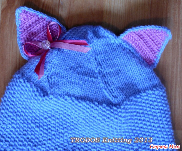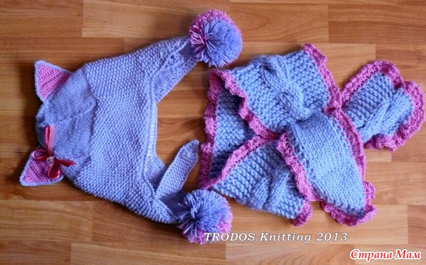 нужен был шарф, хотела я комплект ( я неравнодушна к комплектам), связала шапку-кошку по подобию что гуляет в нете: ушки и тулья- узором "Рис", макушка-гладью, разделенная с убавками в 4х местах.
