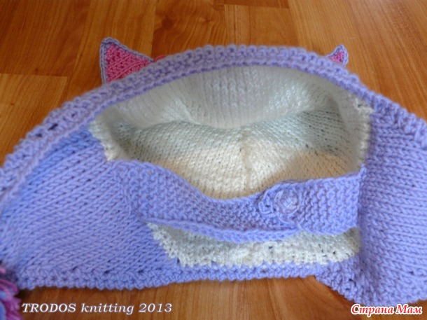 нужен был шарф, хотела я комплект ( я неравнодушна к комплектам), связала шапку-кошку по подобию что гуляет в нете: ушки и тулья- узором "Рис", макушка-гладью, разделенная с убавками в 4х местах.Ушки кошачьи двойные крючком
