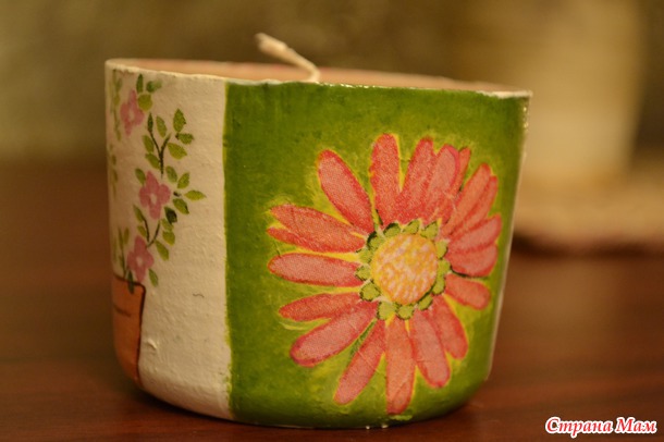 Баночка для кофе. Цвет весь фотоопарат передавать не хочет((((Там с одной стороны один. с другой другой, но по середине они сплетаются что нет четкого перехода. Так же от светлого к темному. Краска наложена в несколько слоев мочалочкой и каждый слой виден через другой слой из за этого получается один общий цвет. А вот сама салетка меня чуть подвела((Качество у нее не очень она от малейшего прикосновения разлазится и как я не пыталась сделать более акуратно, но((((А с кофе или чашками кофейными другую салфетку не нашла((((