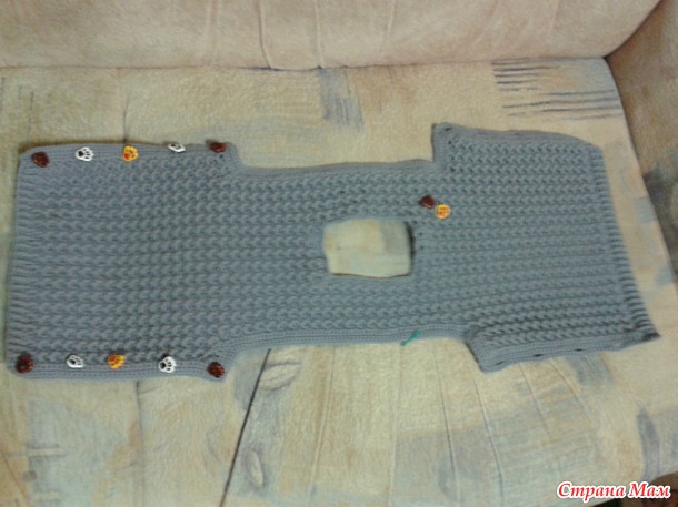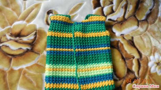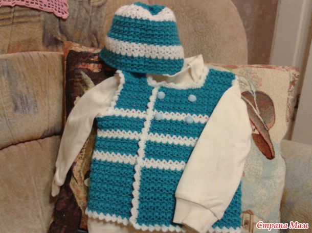 Связалось на одном дыхании, захотелось сначала связать голубой комплект –ушел 1 моток ниток «Бриллиант» и немного белого, затем захотелось повторить безрукавку с застежкой по бокам, но крючком. все связалось за 1,5 месяца теперь будем ждать у кого из родственников раньше будет пополнение, выслушаю с вниманием критику-выставляю первый раз