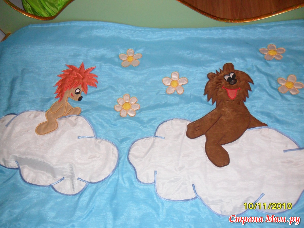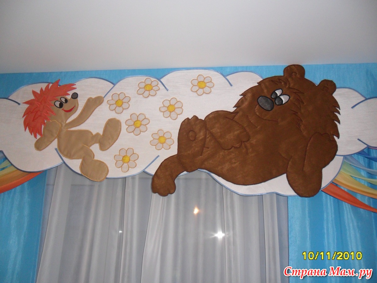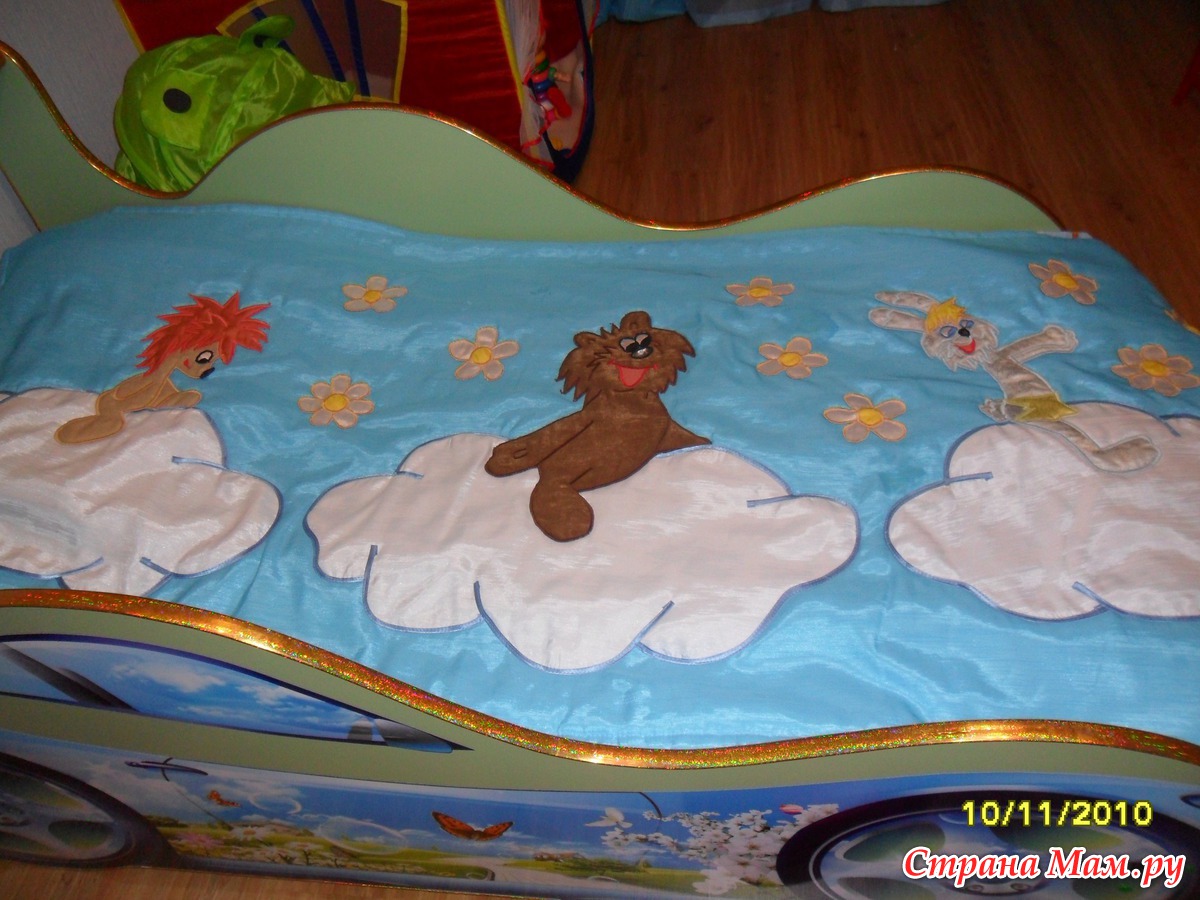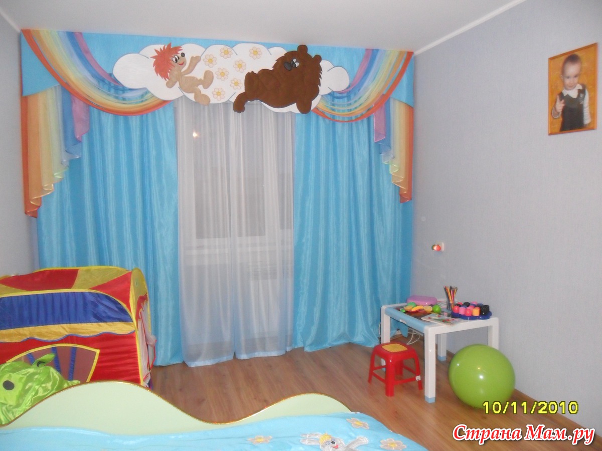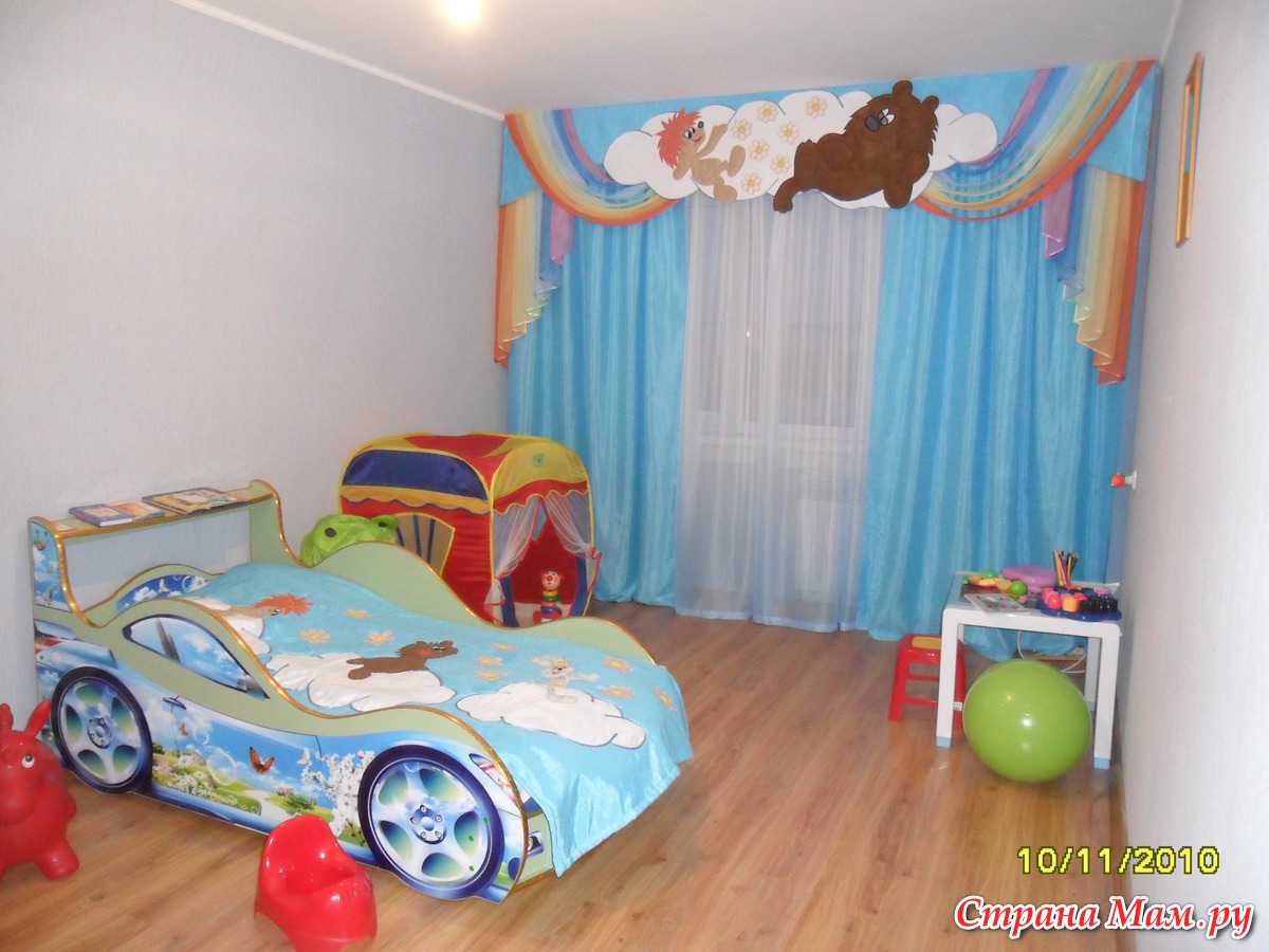 ). Поэтому стоит все не на своих местах. Планируем еще докупить шкаф для одежды, шкаф для книг и игрушек, стол и стул (все в той же тематике как кровать и комод- серия "Природа"). Особая моя гордость- это шторы и покрывало. Перерыла весь интернет, пока нашла то, что хотела. Заказала! И вот они уже висят у моего лапули в комнате! Девочки, а как вам?