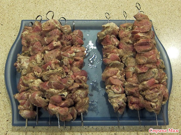 Попросила мужа прикатить мне стул на кухню и обосновалась там! Сделала салат из овощей (медленно и печально, но сделала!). Нанизала шашлык на шампуры. Получилось 10 больших шампуров (всего было 5 кг свинины)