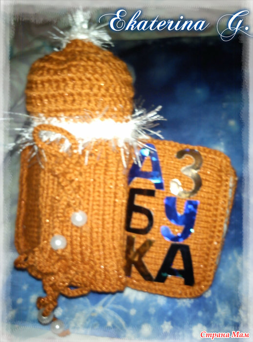 Нашла кусок поролона, обвязала его в виде разложенной "Азбуки". Белая пряжа Джинс, крючок Кловер 1,75, вязала столбиками с накидом, красная "обложка" связана спицами лиц. гладью, буквы из красивого блестящего картона. " Корешок" "Азбуки" связала резинкой и вставила шнурочки, т. к. мне была неизвестна пышность макушки ёлки. Наверху связала что-то типа "шапочки Деда Мороза":