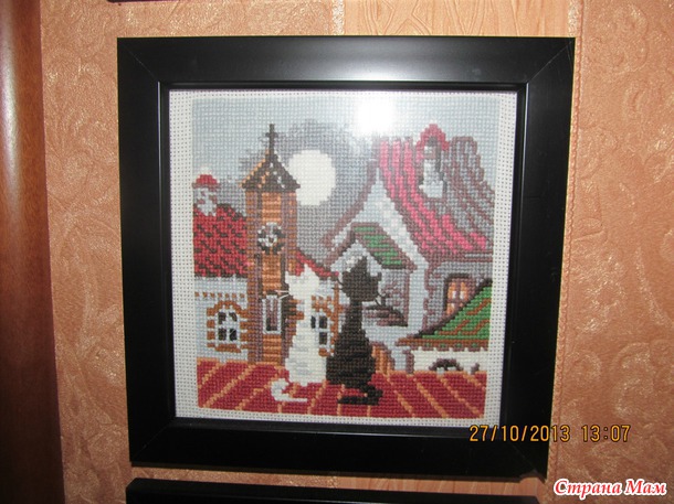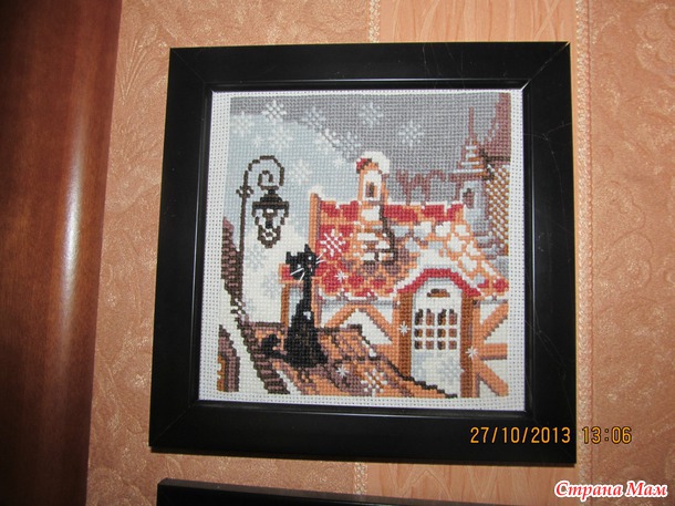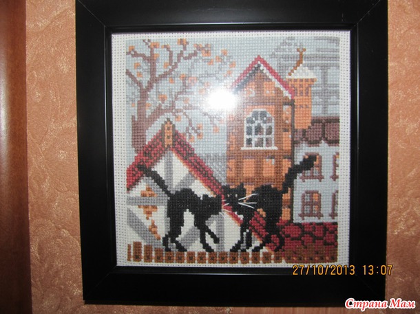 ... Вот так это выглядит... Кошки справа от двери висят...Слева ещё одна серия "Времена года", правда уже не помню чьи это наборы... Они у меня вставлены в рамки на скорую руку... в одной даже попробовала сама сделать паспарту... Так что они ещё ждут своей очереди на украшательство...