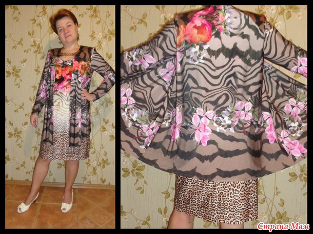 )Очень красивое платье с накидкой, ложной её назвать не могу - и сзади, и спереди, только что не отдельно). Накидка и рукава из трикотажа, что-то типа "масло", основное платье из ткани, похожей на сатин, лицевая сторона блестит - на фото "блик" от вспышки на животе.
