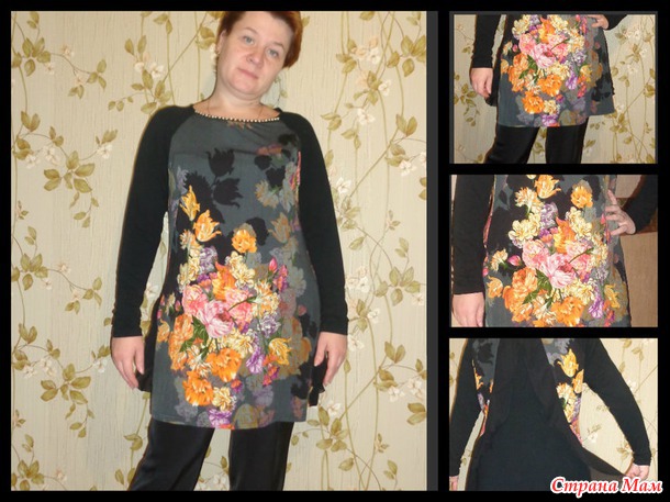 Туника необыкновенная: сочетание черного тонкого трикотажа на спинке и рукавах и серо-черного, более плотного, будто двойного на полочке и отрезных кокетках спинки, плюс черные "крылышки" шифона на спинке, плюс сумасшедшие цветы на полочке! Фотик красоту полно не передает.