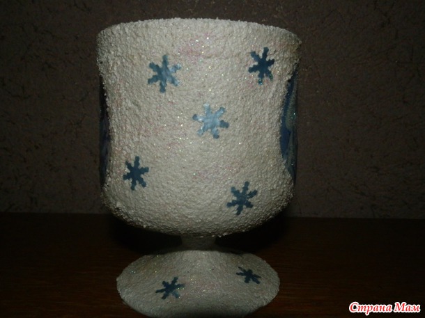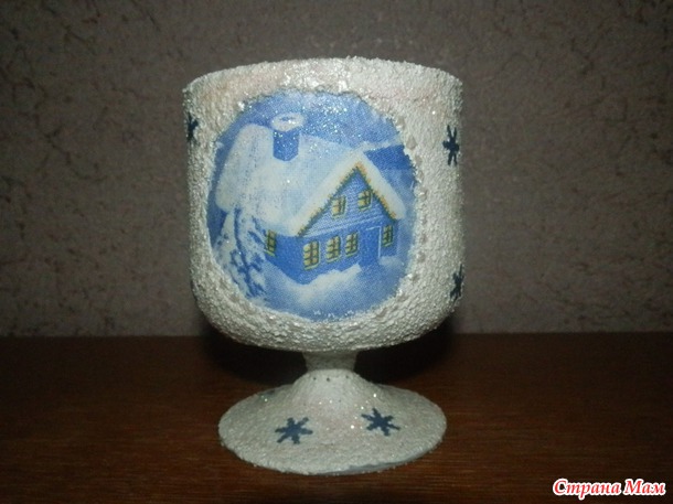 Но в ожидании Новогодних праздников появился вот такой подсвечник В закромах нашелся бокал, который и стал основой для подсвечника, использовала технику декупаж, манку, клей ПВА, акрил белый и блесточки