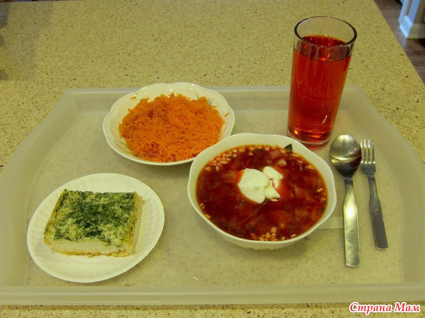 Пообедали сегодня пораньше: борщ со сметанкой и чесночком, хлеб с сыром и укропом, салат (у мужа помидорный, а у нас с Лидой натертая сырая морковка) и компот.