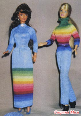 ЮБКА. На спицы пряжей основного цвета наберите 54 п. и вяжите лицевой гладью. Провязав от начала работы 8 рядов, вяжите полосы по 4 ряда пряжей одного из дополнительных цветов (всего 13 полос). Провязав от начала работы 60 рядов, свяжите еще 20-30 рядов пряжей основного цвета. Затем провяжите в одном ряду все петли по 2 вместе лицевыми (= 27 п.). Свяжите еще 3 ряда лицевой гладью.