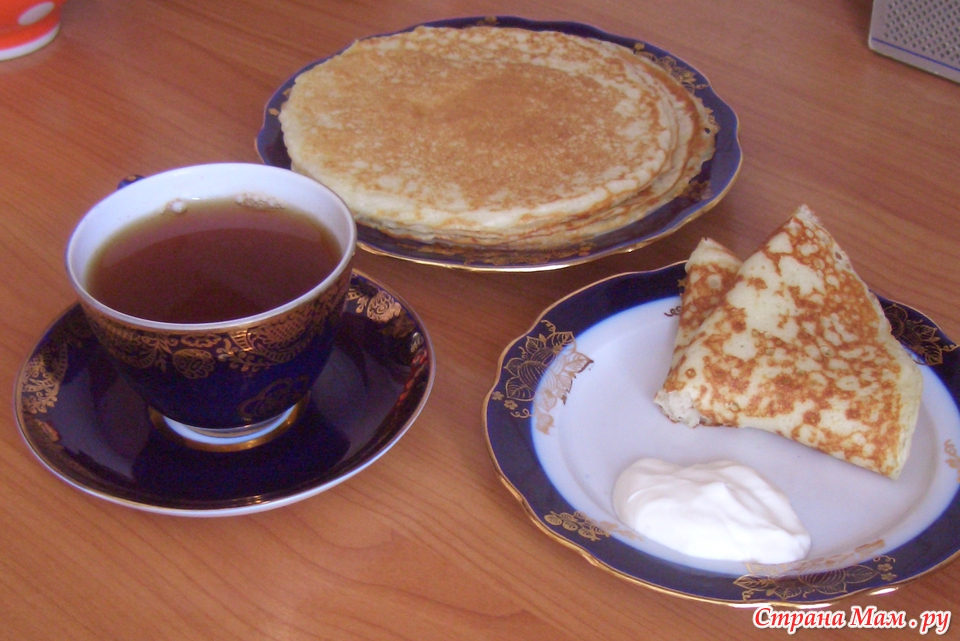 Готовила блины я к обеду, и уже писала выше, что молока по рецепту, на мой взгляд, слишком много. Вполне достаточно двух стаканов. Сразу всё тесто я не использовала, поэтому вечером добавила в него немного муки, блины стали ещё пышнее.