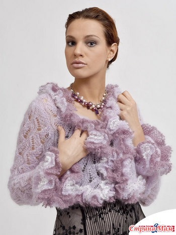 Сборка: выполнить плечевые швы; вырез горловины и края полочек обвязать 1 р. ст. б/н, затем вязать 3 рюша. Для 1-го рюша белой пряжей вязать 5 р., для 2-го рюша сиреневой пряжей вязать 6 р. Выполняя 1-й р. 2-го рюша, крючок вводить в 1-й р. 1-го рюша. Для 3-го рюша фиолетовой пряжей вязать 7 р. Выполняя 1-й р. 3-го рюша, крючок вводить в 1-й р. 2-го рюша. Втачать рукава, выполнить боковые швы и швы рукавов