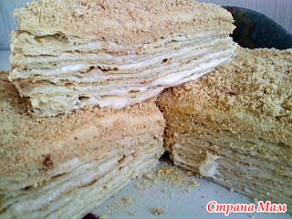 Выпеченные коржи прослоить кремом. Обрезки коржей выпечь и растереть в крошку. Этой крошкой посыпать крем сверху.