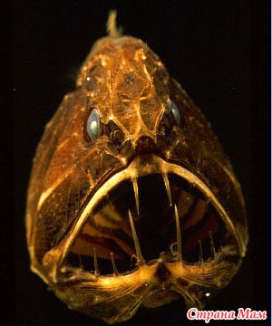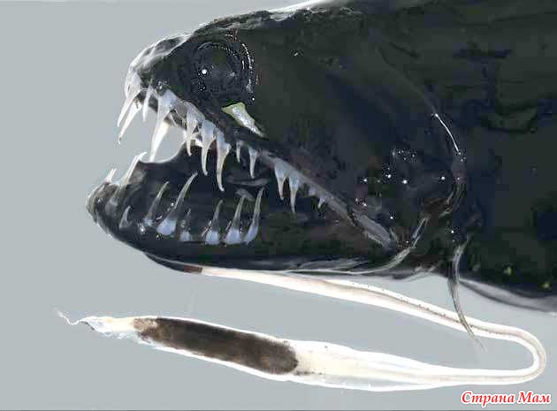 Черная рыба-дракон, или идиакант. Это длинная гибкая рыба, живущая на глубине около 2 тысяч метров. Самки этих рыбешек достигают в длину 40 см и имеют маленькие глазки и длинные зубы, на которые они насаживают других рыб. Глаза личинок этих рыб висят на длинных стебельках и по мере взросления рыбы постепенно достигают глазниц.