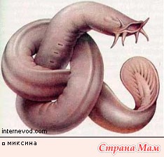 «Рыба-ведьма», или миксина. «Рыба-ведьма», или миксина, - удивительное существо. Это одна из немногих выживших до наших дней бесчелюстных рыб. Чтобы покушать, эта рыбка находит себе труп другой рыбки, забирается в него и выскабливает труп изнутри. Внешне напоминает змею, умеет сворачиваться в узел и даже чихать.