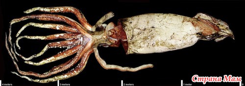 Гигантский кальмар. Огромное существо, обитающее в морских глубинах. Среди моряков из уст в уста ходит легенда о том, что эти чудища способны утащить в пучину не только утлую лодочку, но и целый корабль. И неспроста - ведь этот моллюск может достигать 13 метров в длину!