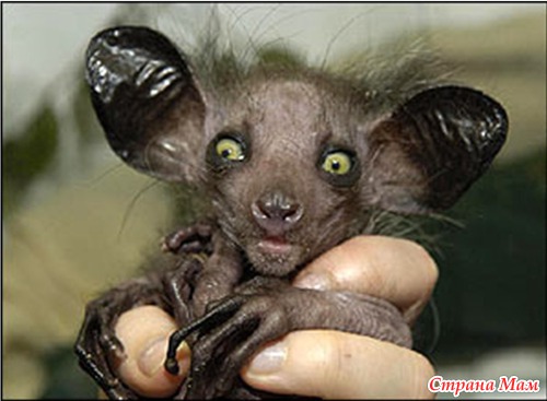 Айе-айе. Довольно милый зверек, живущий на Мадагаскаре. Напоминает эльфа Добби из "поттерианы". У него есть зубы, как у грызуна и длинный палец на руке, которым он выстукивает стволы деревьев и проверяет, нет ли там спрятавшихся личинок. Затем, обнаружив жертву, этим же пальцем выковыривает ее из убежища. Однако мадагаскарцы верят, что айе-айе – символ смерти, и человеку, который встретил айе-айе в лесу, грозит гибель.