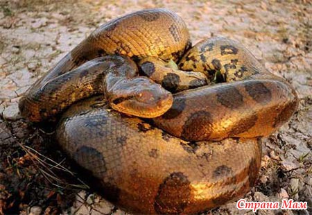 «Убийца слонов» или Анаконда. Самая тяжелая змея в мире (до 250 кг). Глаза и ноздри расположены на макушке головы, благодаря чему анаконда может дышать и видеть объекты для нападения, находясь почти полностью в воде.