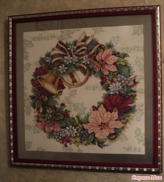 От автора: "Это вторая работа из комплекта, который планирую вышить. Уже есть сапожок, теперь и веночек появился. планировала сделать подушку, но пока решила оформить картиной. Оформляла сама, рамка для постеров и рисунков, паспарту - картон"