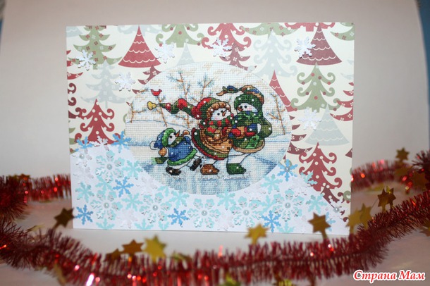От автора: "Наконец-то мои снеговики оделись потеплее, достали свои серебряные коньки и готовы идти кататься. Вот какие сугробы намело, а вокруг стоят нарядные елочки и снег идет"