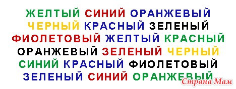 Глядя на эти слова произнесите вслух как можно быстрее цвета, которыми эти слова написаны. Не сами слова, а их ЦВЕТА.