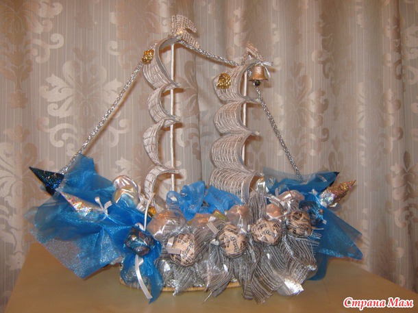 Вдохновилась на творчество я, прочитав с месяц назад пост страномамочки с просьбой дать совет, как необычно подарить деньги на свадьбу. Там увидела такой конфетный корабль, полюбовалась и забыла.