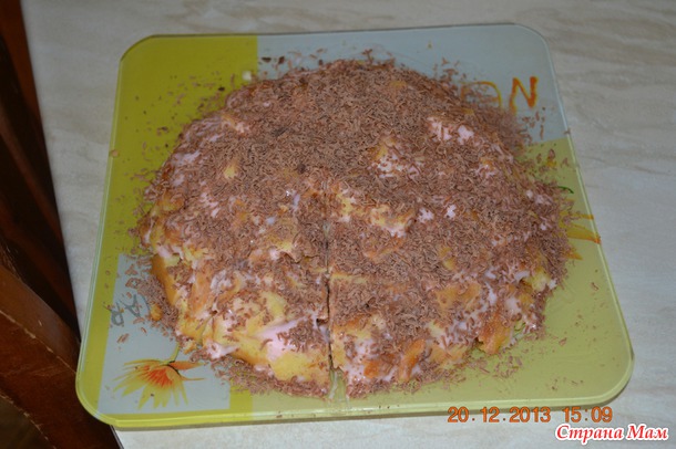 4 яйца смешать с 125 гр масла сливочного (предварительно растопить), смешать с 500 мл теплого молока, 110 г сахара, ванилин 1 пачка, 1 ст. лож. теплой воды, 115 г муки, Смешать хорошо и в заранее разогретую духовку 175 С минут на 45, смотрим, проверяем палочкой. Вытаскиваем, остывает, рвем на части и все складываем слоями и промазываем клубничным йогуртом, сверху шоколадом.