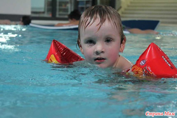 - может сам плавать с нарукавниками. Сам без помощи вылезает на бортик. Прыгает в воду солдатиком, до последнего времени нужно было его вылавливать из воды, но сейчас прыгает сам и даже иногда разворачивается в воде в направлении бортика до того, как выскакивает из воды. Под водой плавать еще не умеет.