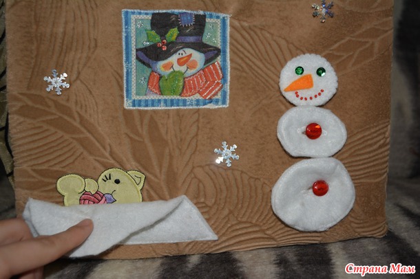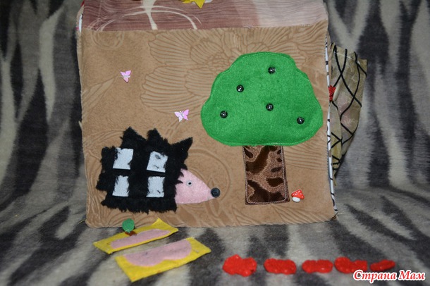 На одной стороне у нас лето, на деревце растут яблочки, ежик несет яблочко домой(яблочки на дереве на кнопках, их можно разложить от меньшего к большему, посчитать до пяти, яблочко у ежика это пазл, в будующем хочу еще дошить пазлы листик, грибок и грушку)