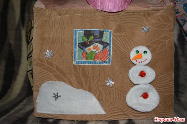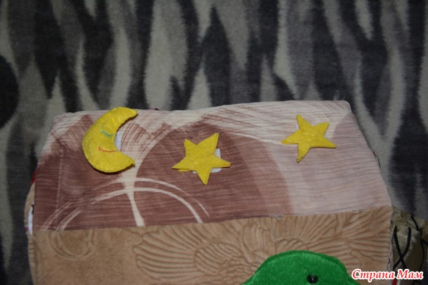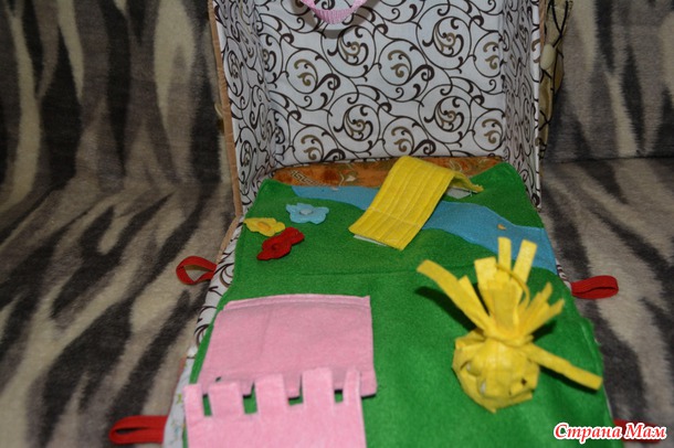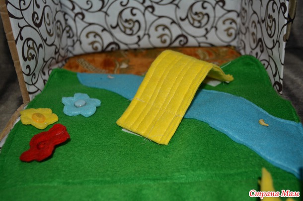 Так как изначально задумывался домик ферма, то внутренняя часть была в виде лужайки с речкой, но я промахнулась с выкройкой и уже было расстроилась, но потом подумала что может это и к лучшему, сделала лужайк сьмной, а внутреннюю сторону нейтральной, так что когда доча подрастет ее вполне можно использовать как домик для куколки.