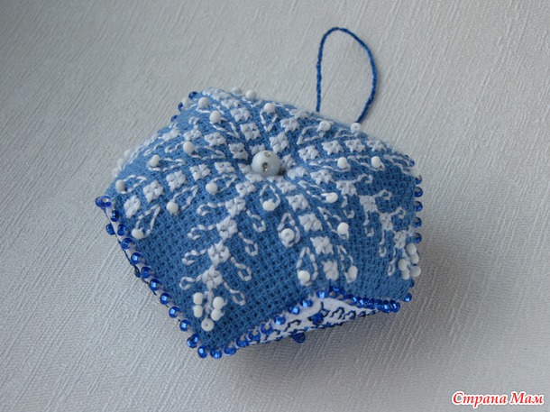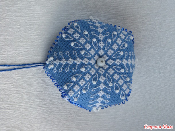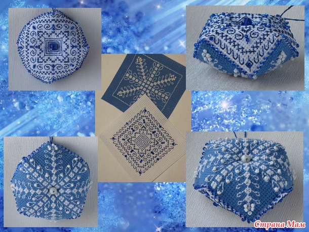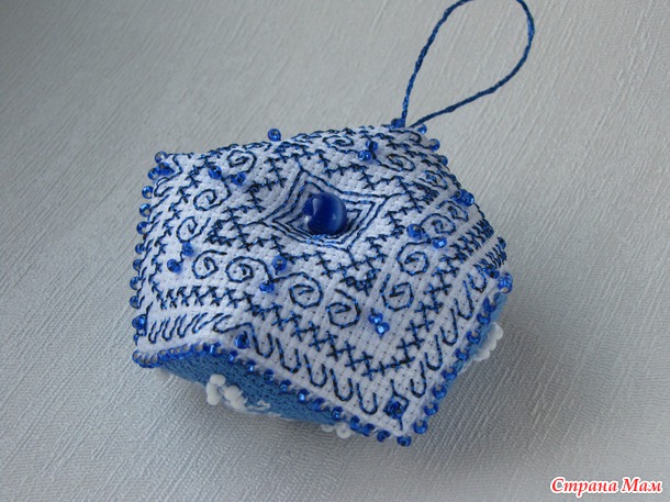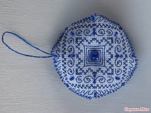 Воодушевившись двумя уже вышитыми новогодними бискорню , которые заняли место на нашей домашней ёлочке, я вышила ещё одну - сине-белую.