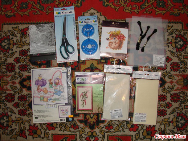 , набор вышивки лентами, давно хотела попробовать, и наборчик от Алисы из моих хотелокну и в завершении: блокнот(нужен для работы), портновские ножницы и устройство для изготовления помпонов.