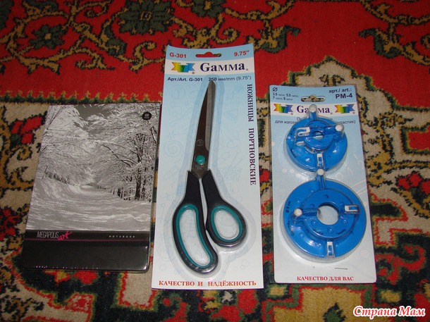 ну и в завершении: блокнот(нужен для работы), портновские ножницы и устройство для изготовления помпонов.
