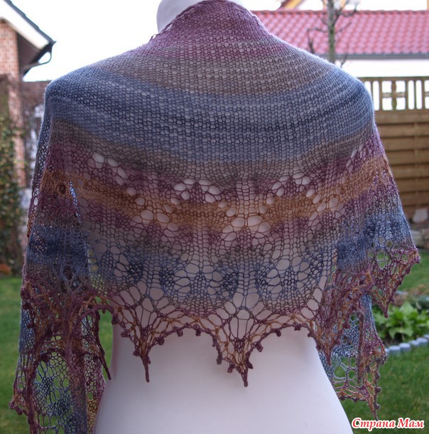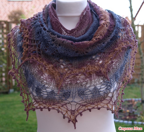 Ниточки вязала Lana Grossa Lace Merino Print 111 braun-grau 50g Wolle, в 50гр 400м. Подрасчитала так, что ушёл весь моточек. Спицы номер 4 Вначале немного насторожила расцветка, но результатом, переходами цветов я осталась довольна.