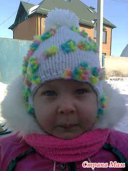 Дочке 5 лет. Просто у нас куртка в разных оттенках фуксии и розового, мне и показалось,что подойдет и совсем забыла, что пряжа практически без розовых цветочков