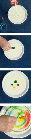 3. А теперь, хотите верьте, хотите нет, мы заставим молоко двигаться с помощью обычного моющего средства! Возьмите ватную палочку, окуните ее в средство и прикоснитесь ей в самый центр тарелки с молоком. Посмотрите, что произойдет! Молоко начнет двигаться, а цвета перемешиваться. Настоящий взрыв цвета в тарелке!