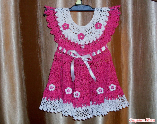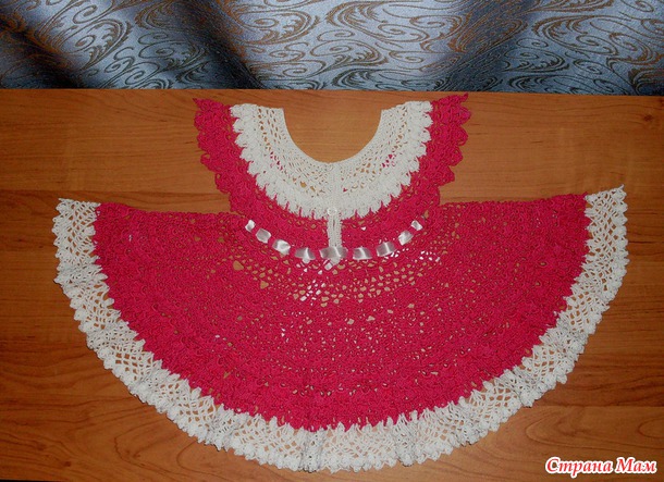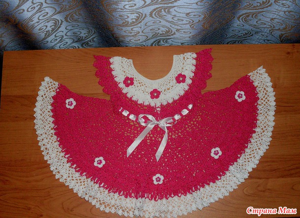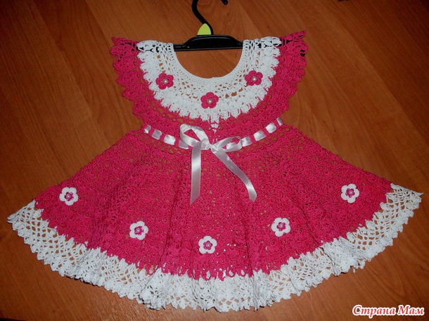Вязала из Pelicana, крючком № 1,5. Ушло 2 малиновых моточка и половина белого. Платье получилось как раз на годик, но я искренне надеюсь, что мы сможем его еще летом одеть.