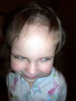 недолго думая отфигачила ей чёлку от середины головы и причесала на перёд, а потом в саду залила это дело литром лака для волос и вот что получилось!
