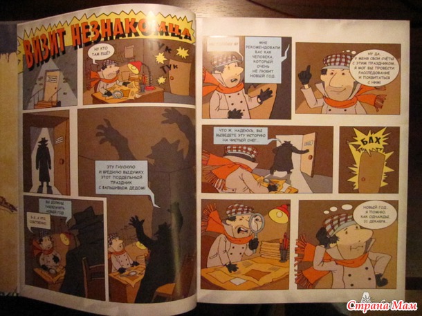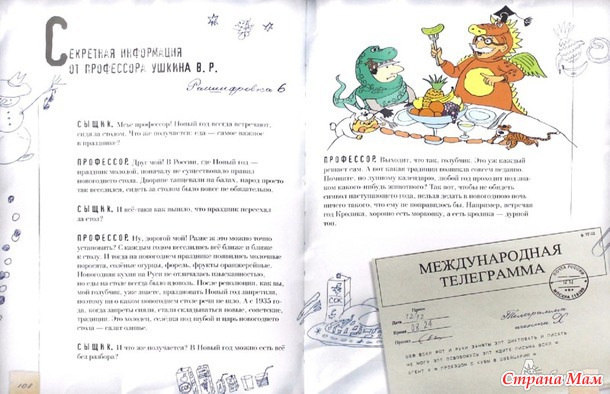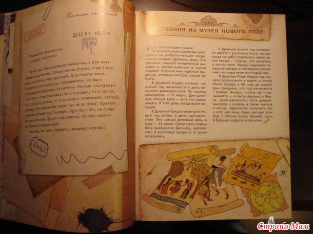 Дел всего 8 и у каждого своё название, например "Дело №1" называется "Дата" и тут расследуют почему именно НГ празднуют 1 января, про царя Петра I тоже рассказывают, ведь он велел праздновать Новый Год 1 января... также рассказывают в каких странах отмечают НГ в другое время... в каждую главу-дело добавлен рассказ, стихи, песенки... а от изобретателя Вити есть интересные идеи поделок, заготовки есть в конце книги в кармашке... ну в таком вот духе каждая глава, которая представлена "Делом под номером"