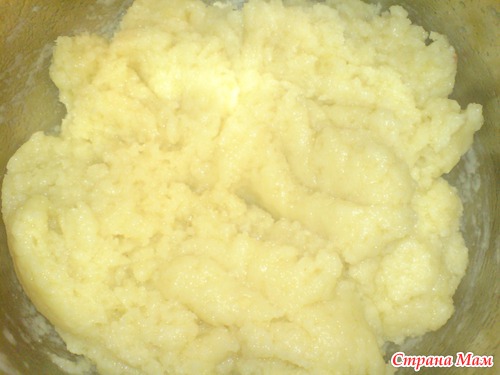 Когда смесь закипит всыпать 1,5 стакан муки, помешивая. Огонь выключить. Вот что получается.