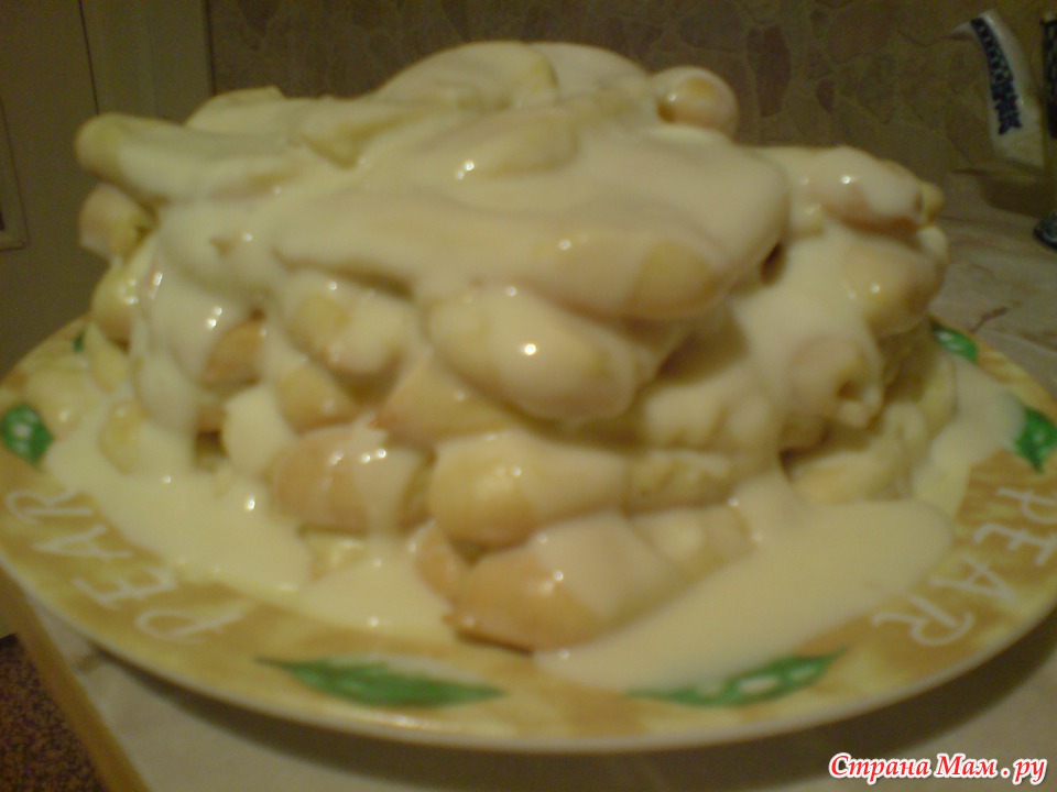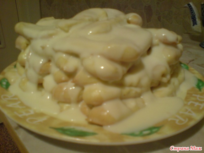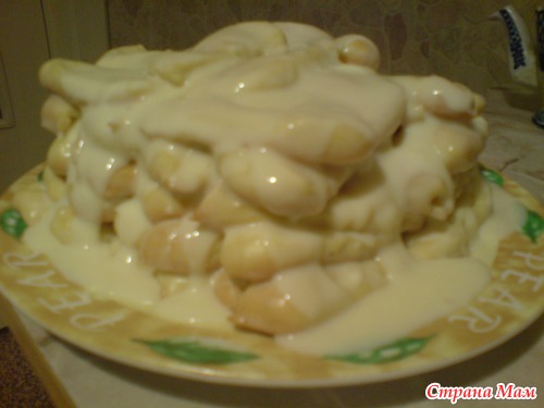 Взбить крем. Испеченные "пальчики" обмакнуть в кpем (не жалеть, хватит на все) и сложить на блюдо поленницей. Свеpху можно посыпать какао или теpтым шоколадом (у меня не было, поэтому оставила все как есть).