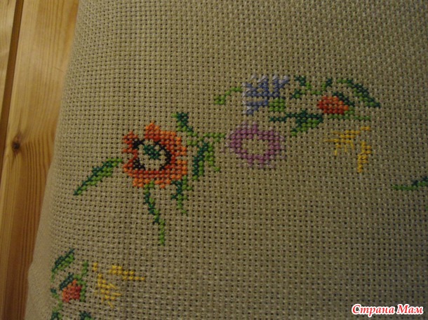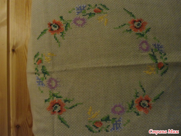 потом принесла скатерть и говорит, хочу в деревенском стиле. в центре вышились цветочки с колосками, а по углам маки