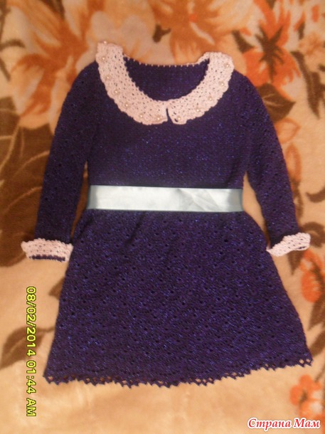 Девочки, нашла вот такую красоту, очень понравилось платье, если использовать темные нитки, то как школьный вариант, думаю если связать с ярких, насыщенных цветов, то будет даже очень праздничный наряд.