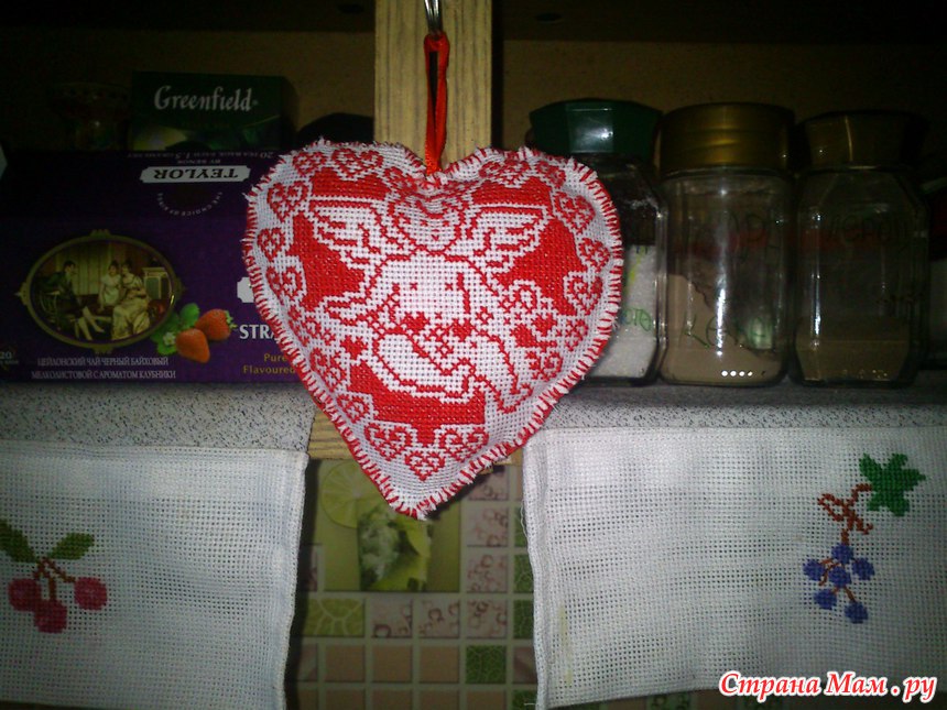 Не знаю, мне ли так везет с этими наборами, или это у всех наборов от этой фирмы такая история, но мне в очередной раз не хватило ниток. Пришлось докупать ниточки из зеленой и сиреневой гаммы. И, как назло, конечно же, в магазинах нужных оттенков не оказалось. Пришлось заказывать и ждать. Пока ждала - вышила сердечко с ангелочком. Оно с травкой внутри, поэтому не только украшение, но ароматизатор воздуха. Повесила на кухонную полочку. Схемка была из журнала "Вышивка крестом" № 1