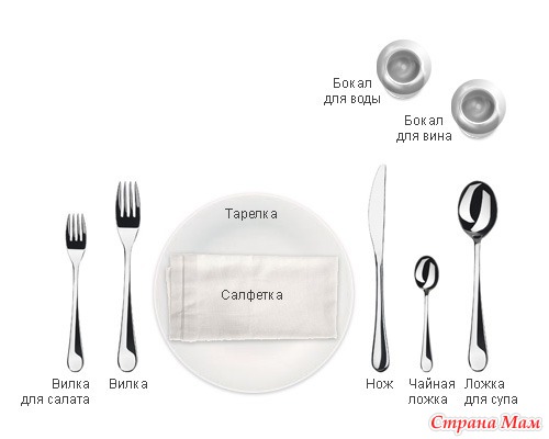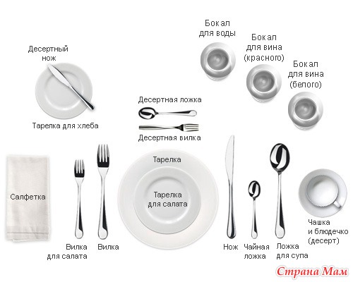 Основные столовые приборы в зависимости от разнообразия блюд могут быть нескольких видов. На столе непременно должны быть и приборы, которыми берут пищу с общих блюд, не сервированных порциями: отдельные ложки, вилки, совочки, щипцы и т. д. С общего блюда пищу накладывают на свою тарелку большой ложкой и вилкой: ложку держат в правой руке, вилку в левой. С помощью вилки накладывают пищу в ложку, ложкой же лишь ее поддерживают или берут подливу. Соусы или супы в свою тарелку наливают специальными половниками, при этом надо быть очень осторожным и не капнуть на скатерть. Если же случится подобная неприятность, нужно незаметно промокнуть салфеткой это место или положить на него матерчатую салфетку (если скатерть очень загрязнилась). Если же вы просто немного капнули на скатерть, постарайтесь не привлекать всеобщее внимание. Своим беспокойством и ненужными причитаниями вы нарушите атмосферу застолья. Десертными приборами едят закуски и пирожные. Это вилки, ножи и ложки, но меньшие по величине. Специальные приборы для салатов, кофейные и мекка-ложечки, щипцы для сахара, щипцы или лопаточки для торта дополняют основные приборы.