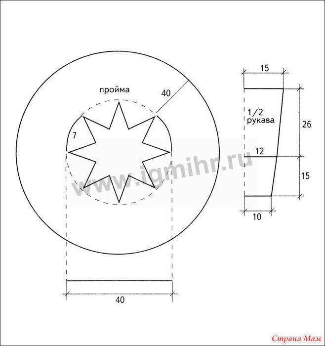 Вязать центральную часть жакета крючком № 2,5 по схеме 1. Затем определить места для пройм согласно выкройке. Для прорези рукавов связать цепочки из возд. п. длиной 30 см, закрепить их соед. столбиком и продолжать вязание оборки по кругу крючком № 3 согласно схеме 2. Затем связать рукава по схеме 3. Вязать от проймы 5 рядов крючком № 3,5; 5 рядов крючком № 3, далее вязать крючком № 2,5 до расширения. Расширение рукава вязать крючком № 3. Нижнюю часть жакета вязать крючком № 3,5 двумя вертикальными раппортами по схеме 4.